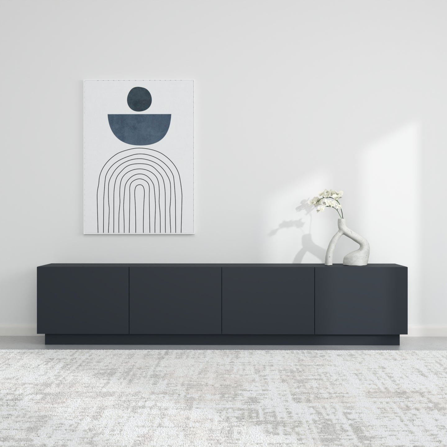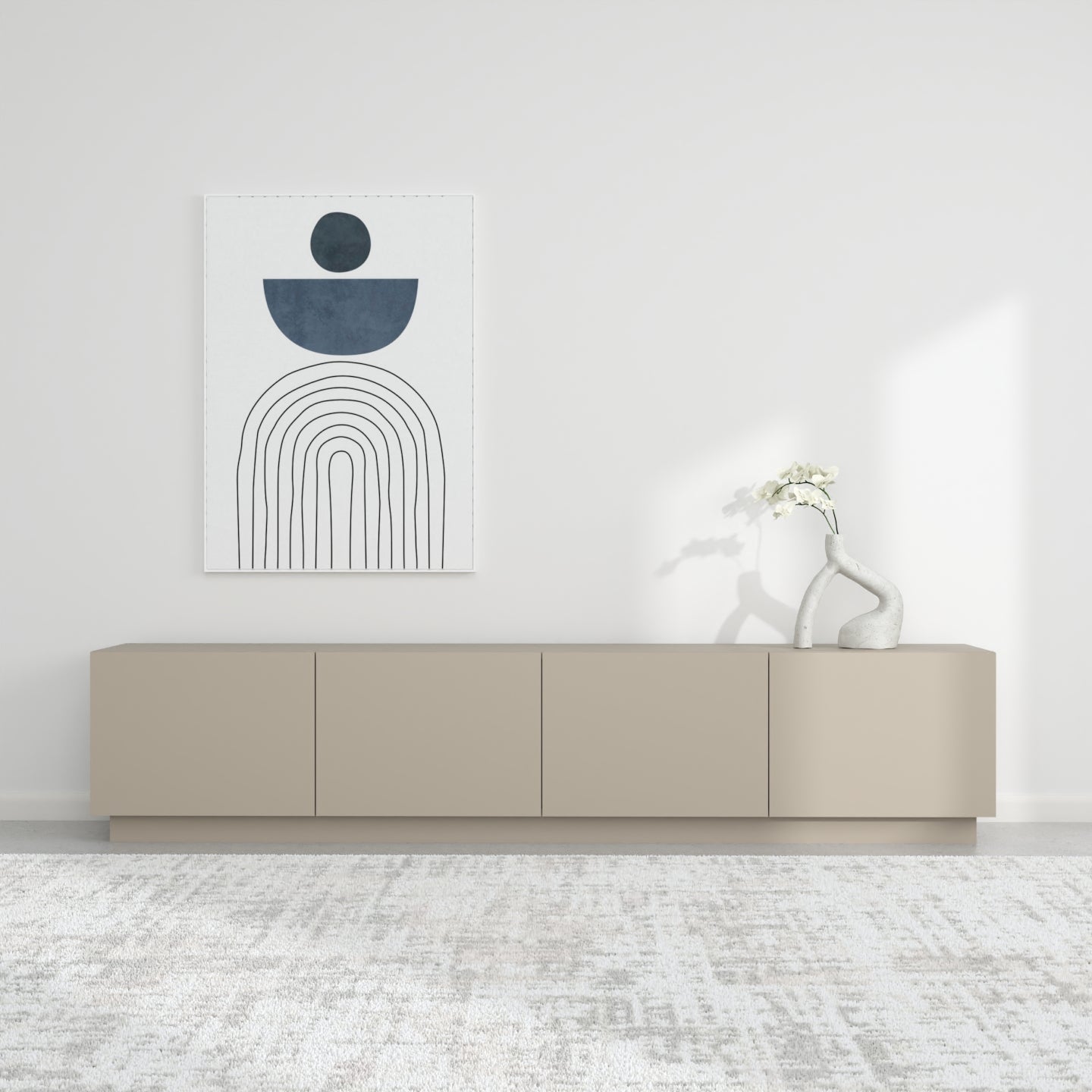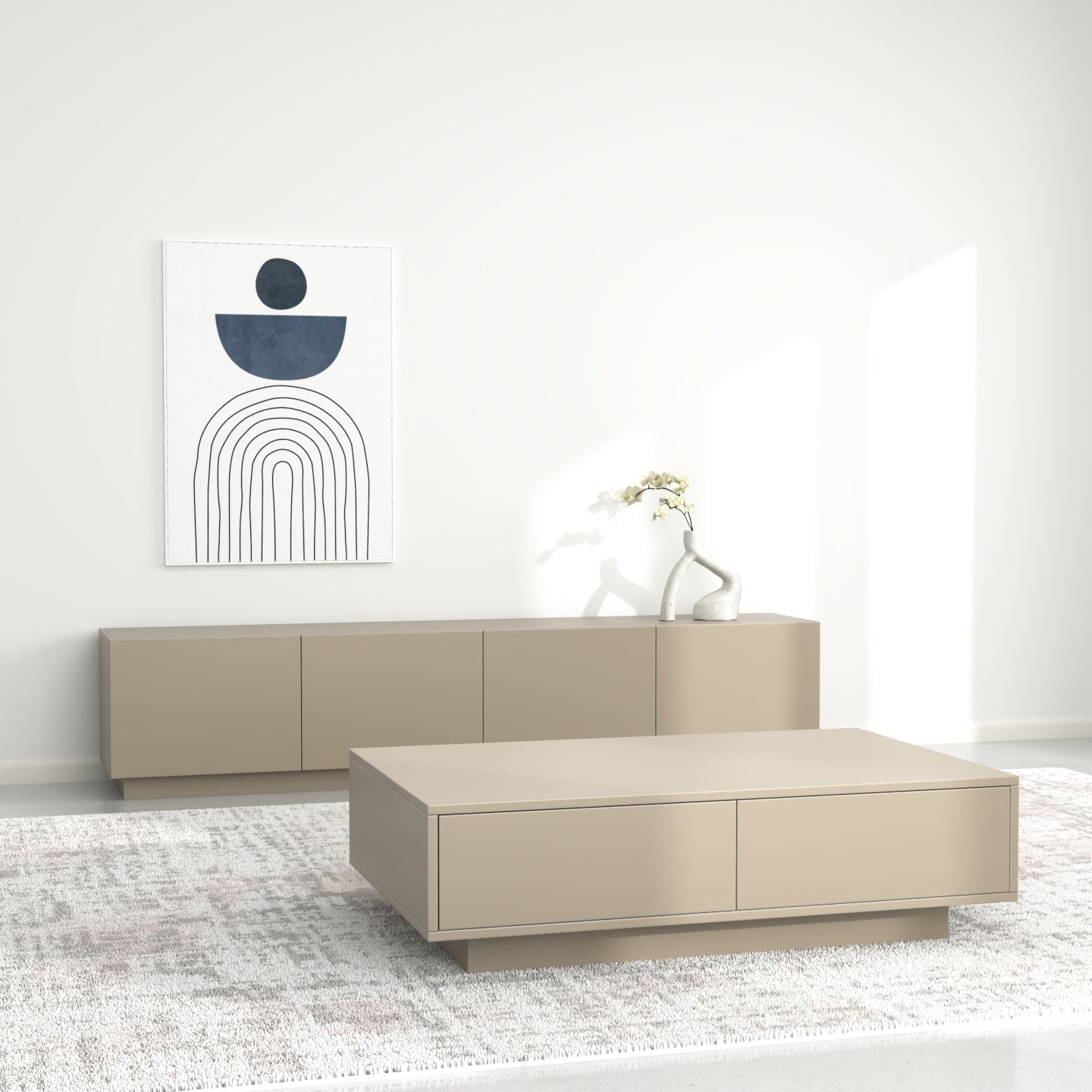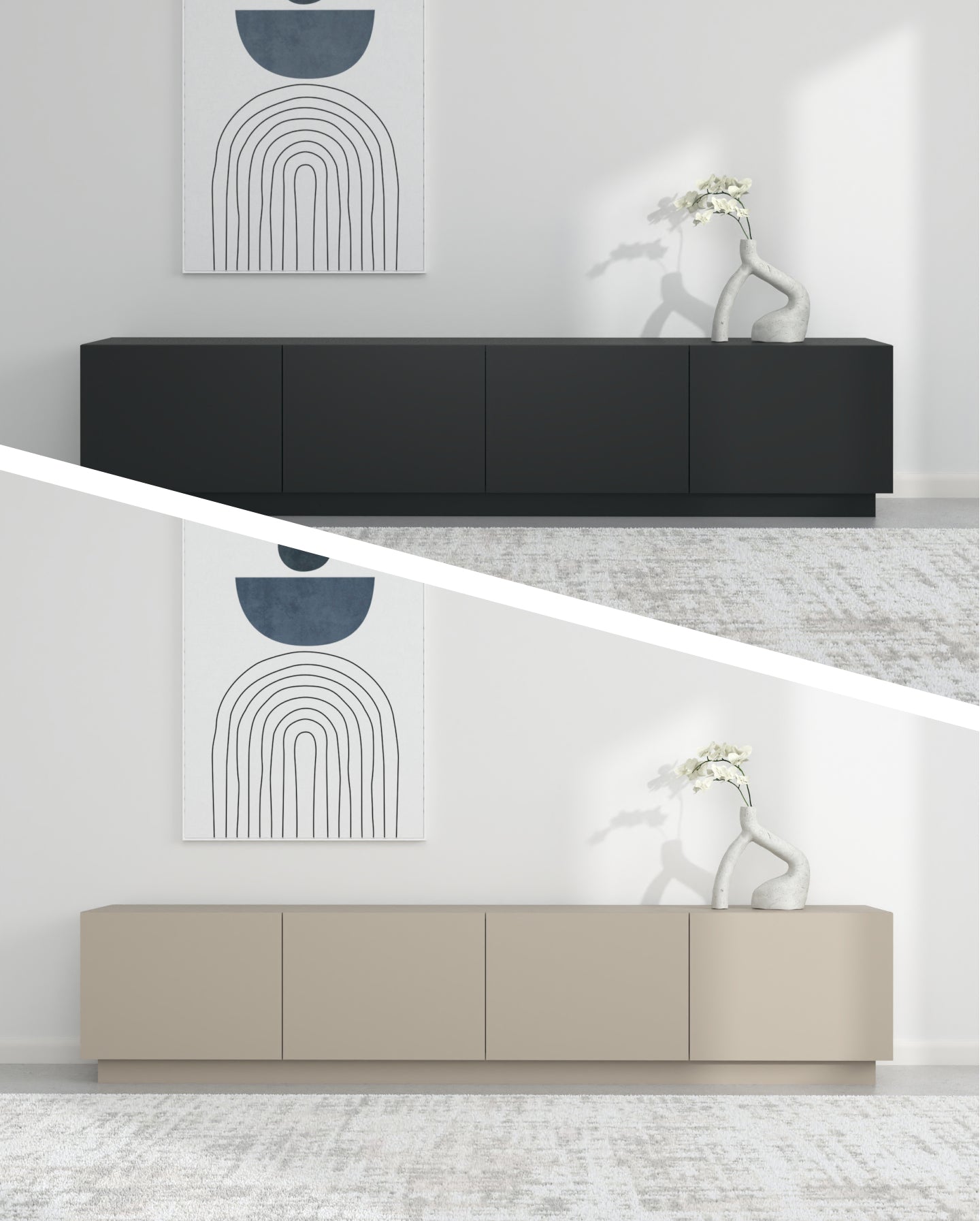 Zgjedhja e pesë ngjyrave neutrale dhe të sofistikuara - e bardha, e zeza, bezhë, blu e errët dhe gri - lejon që komodina të integrohet pa probleme në stile të ndryshme të brendshme, nga bashkëkohore në klasike.