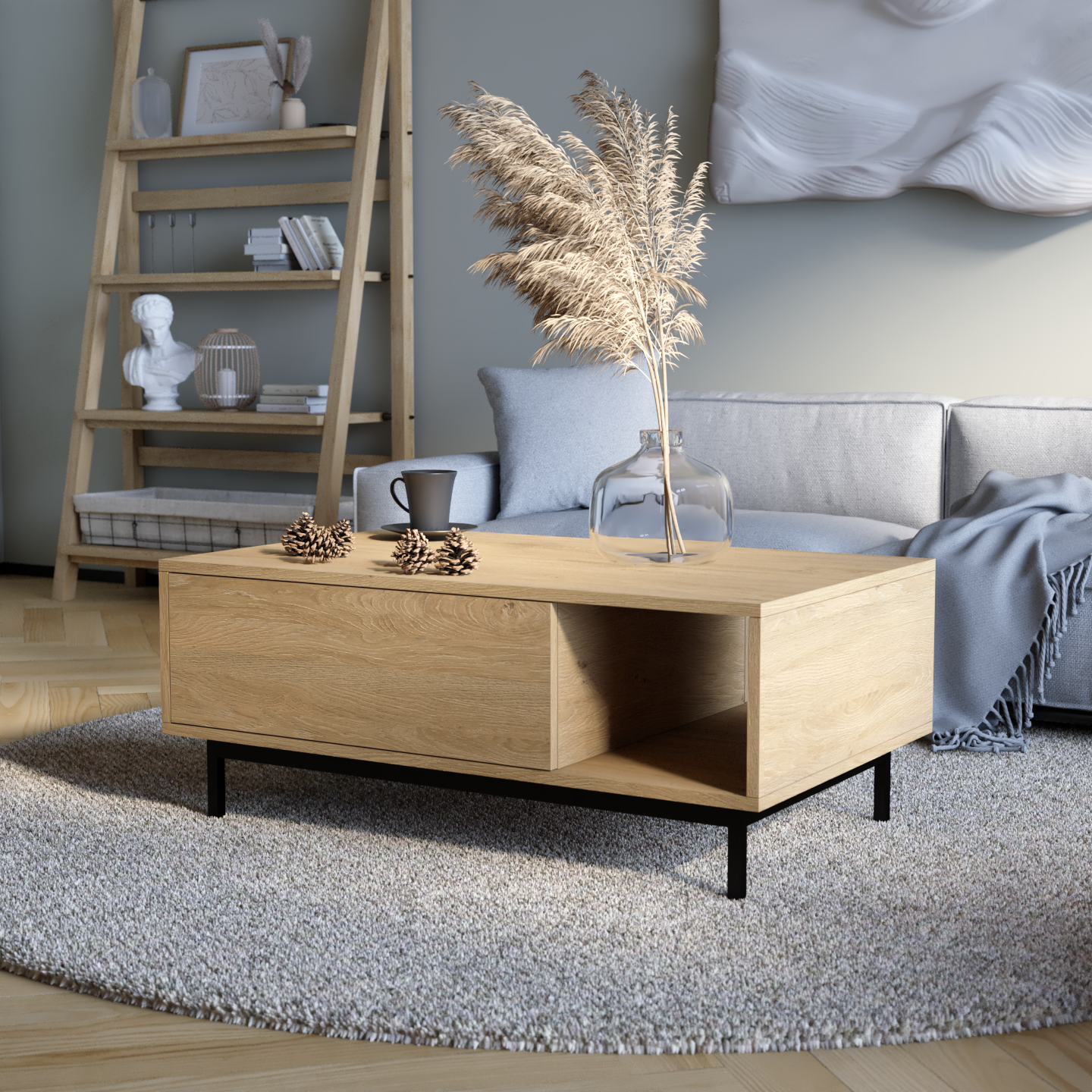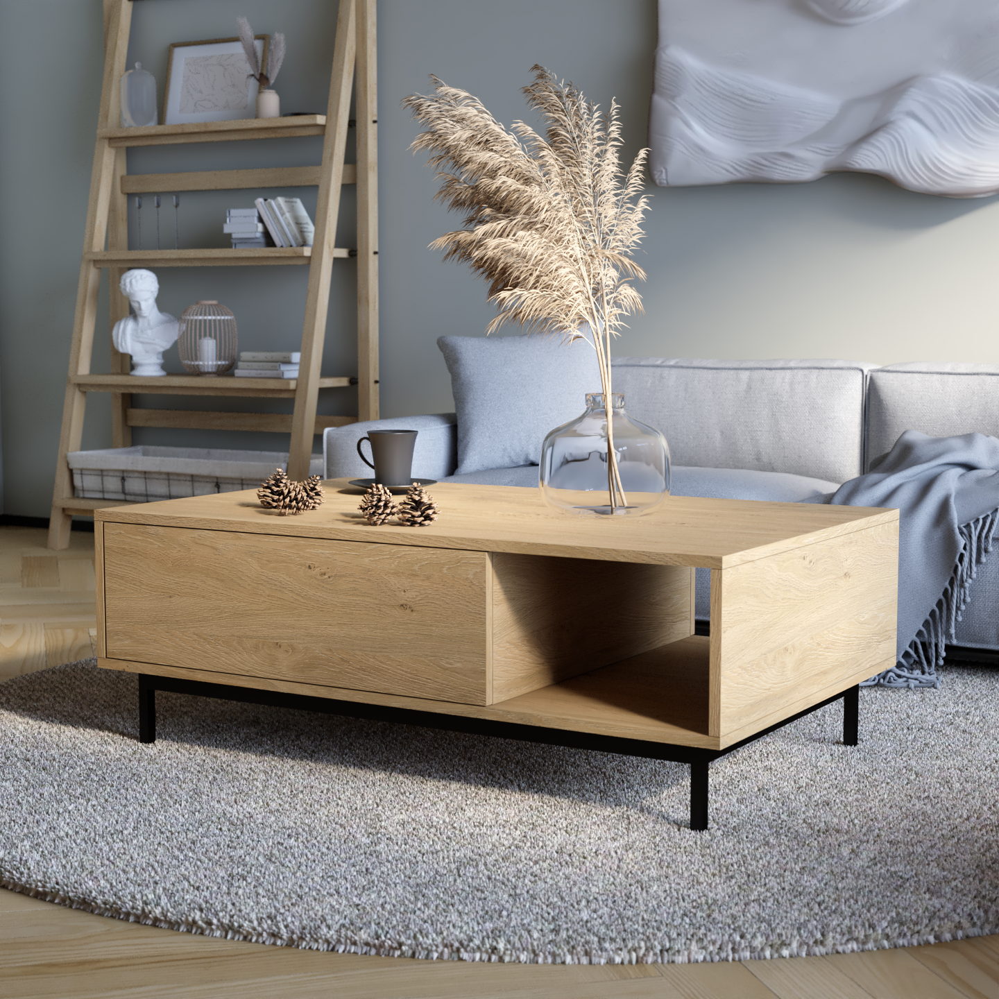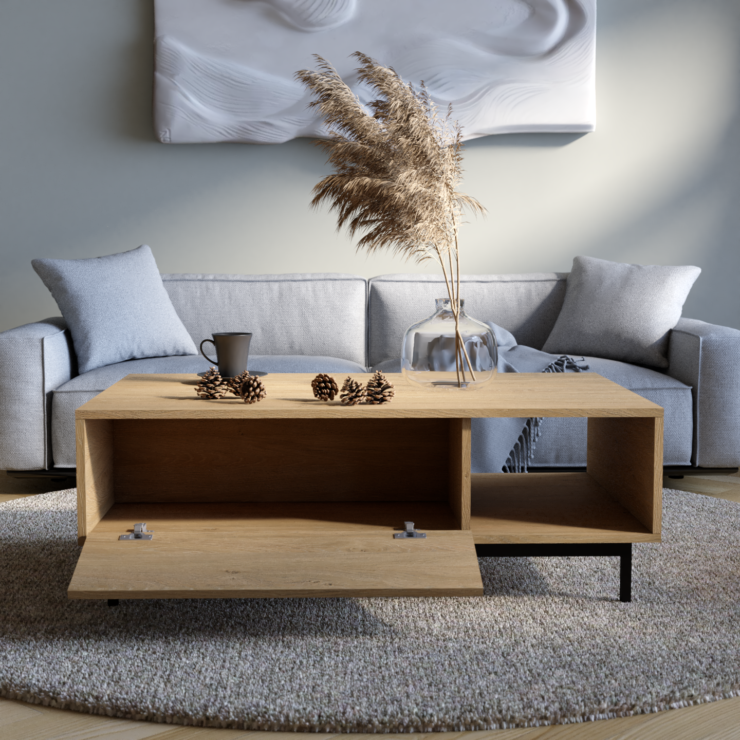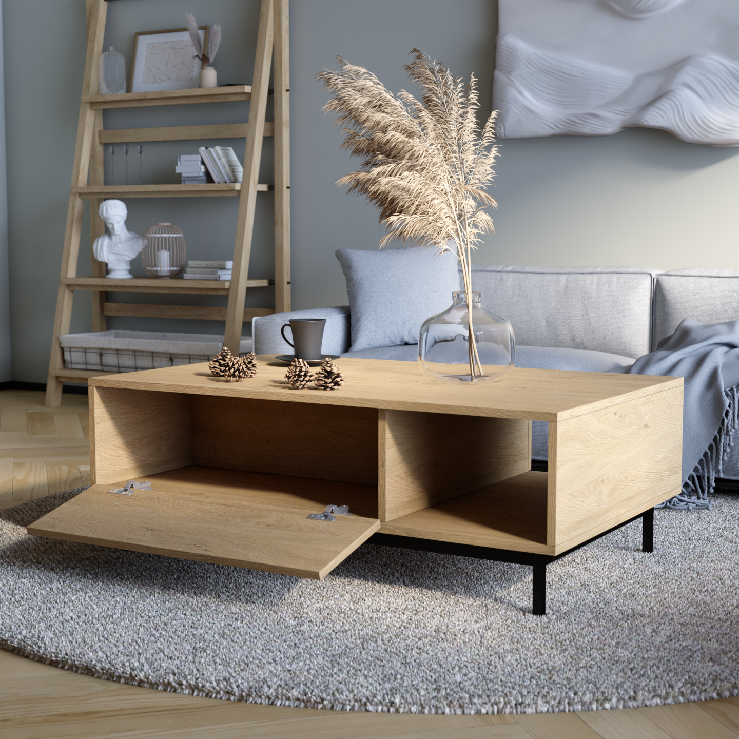 "Naya" kombinon stilin me funksionalitetin e zgjuar. Ajo përmban një raft të hapur për qasje të lehtë dhe dy ndarje të mbyllura që hapen me një shtypje të lehtë, duke siguruar ruajtje të përshtatshme me një pamje moderne dhe elegante.