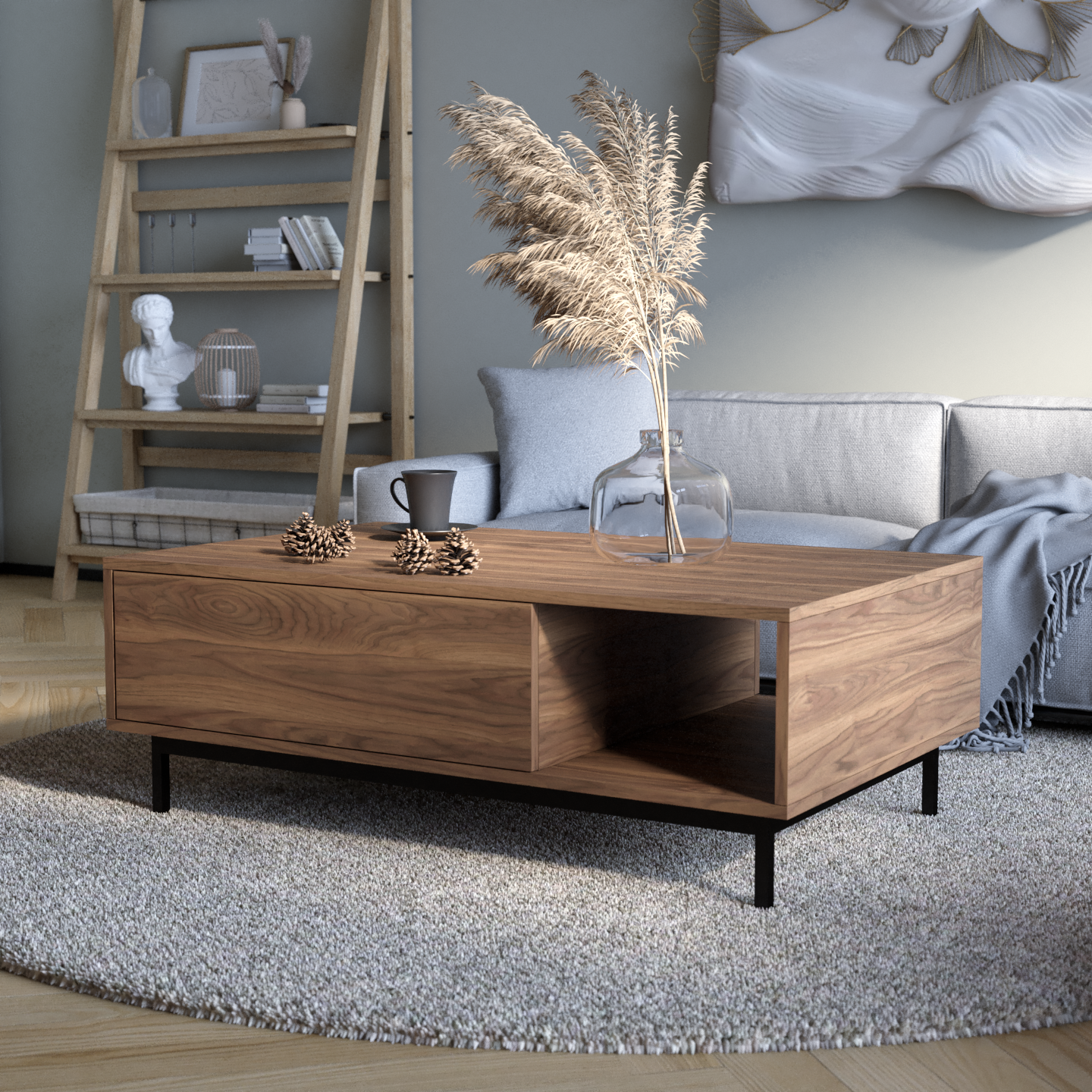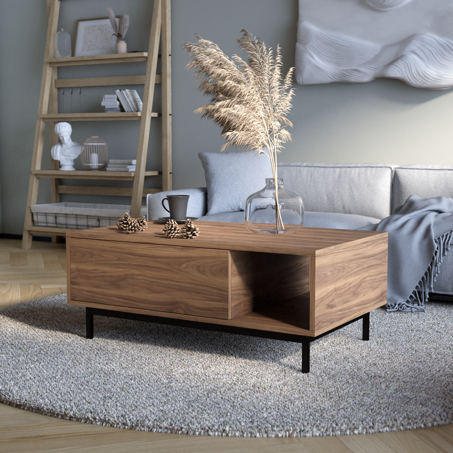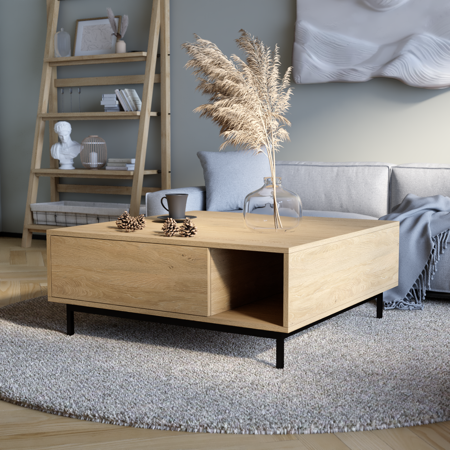 "Naya" kombinon stilin me funksionalitetin e zgjuar. Ajo përmban një raft të hapur për qasje të lehtë dhe dy ndarje të mbyllura që hapen me një shtypje të lehtë, duke siguruar ruajtje të përshtatshme me një pamje moderne dhe elegante.